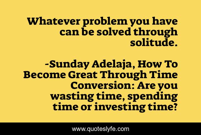 This page presents the quote "Whatever problem you have can be solved through solitude.". Author of this quote is Sunday Adelaja, How To Become Great Through Time Conversion: Are you wasting time, spending time or investing time?. This quote is about solutions-to-problems, solitude, life, conversion, productivity, wealth, greatness, problem-solving, waste,.