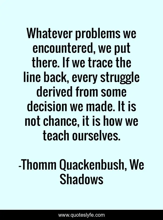 This page presents the quote "Whatever problems we encountered, we put there. If we trace the line back, every struggle derived from some decision we made. It is not chance, it is how we teach ourselves.". Author of this quote is Thomm Quackenbush, We Shadows. This quote is about lessons, teach, problems, destiny, fate,.