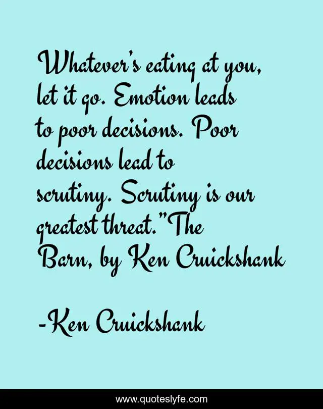 This page presents the quote "Whatever’s eating at you, let it go. Emotion leads to poor decisions. Poor decisions lead to scrutiny. Scrutiny is our greatest threat.”The Barn, by Ken Cruickshank". Author of this quote is Ken Cruickshank. This quote is about novel, suspense, psychological-thriller, thriller,.