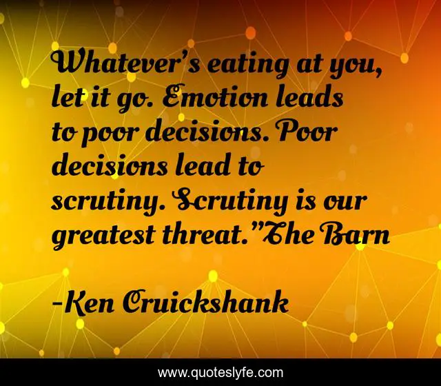 This page presents the quote "Whatever’s eating at you, let it go. Emotion leads to poor decisions. Poor decisions lead to scrutiny. Scrutiny is our greatest threat.”The Barn". Author of this quote is Ken Cruickshank. This quote is about novel, suspense, psychological-thriller, thriller,.
