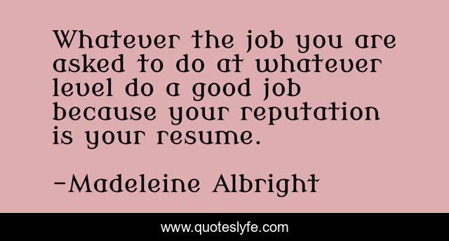 This page presents the quote "Whatever the job you are asked to do at whatever level do a good job because your reputation is your resume.". Author of this quote is Madeleine Albright. .