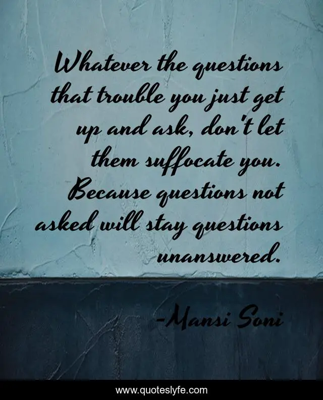 This page presents the quote "Whatever the questions that trouble you just get up and ask, don't let them suffocate you. Because questions not asked will stay questions unanswered.". Author of this quote is Mansi Soni. .