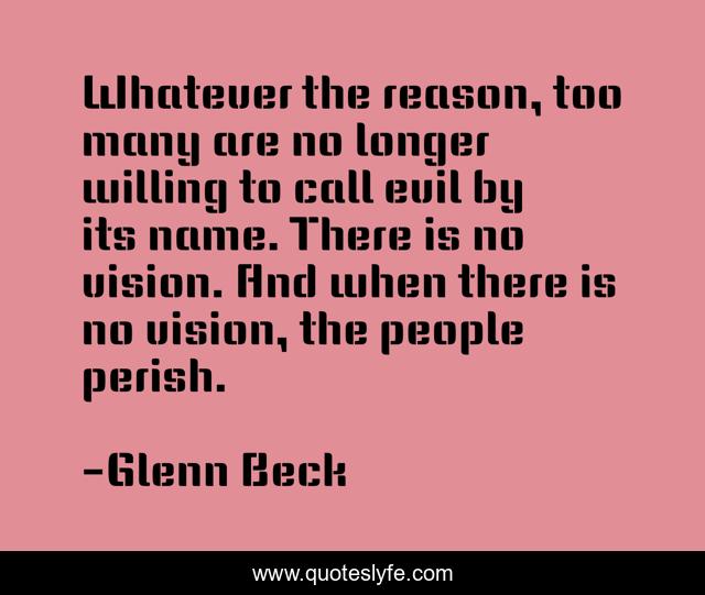 This page presents the quote "Whatever the reason, too many are no longer willing to call evil by its name. There is no vision. And when there is no vision, the people perish.". Author of this quote is Glenn Beck. .