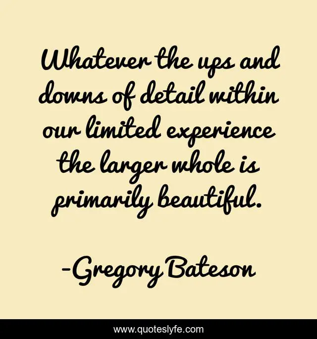 This page presents the quote "Whatever the ups and downs of detail within our limited experience the larger whole is primarily beautiful.". Author of this quote is Gregory Bateson. This quote is about positive, confidence,.