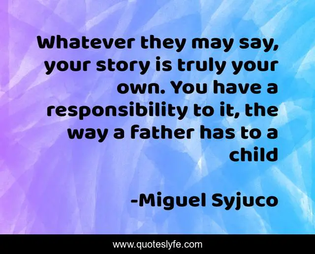 This page presents the quote "Whatever they may say, your story is truly your own. You have a responsibility to it, the way a father has to a child". Author of this quote is Miguel Syjuco. This quote is about story, independence,.
