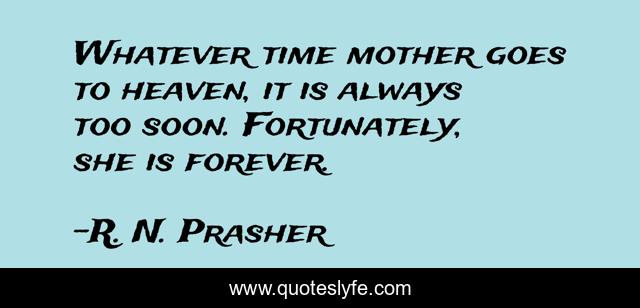 This page presents the quote "Whatever time mother goes to heaven, it is always too soon. Fortunately, she is forever.". Author of this quote is R. N. Prasher. This quote is about forever, heaven, affection, parent, mother,.