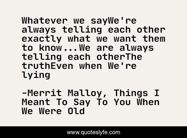 This page presents the quote "Whatever we sayWe're always telling each other exactly what we want them to know...We are always telling each otherThe truthEven when We're lying". Author of this quote is Merrit Malloy, Things I Meant To Say To You When We Were Old. This quote is about relationships, honesty, lying,.