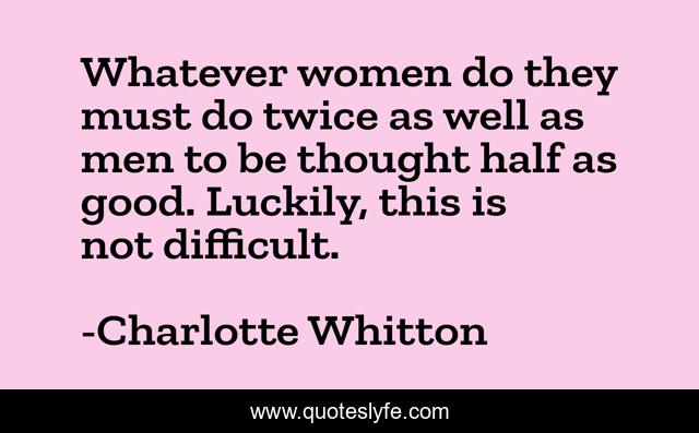 This page presents the quote "Whatever women do they must do twice as well as men to be thought half as good. Luckily, this is not difficult.". Author of this quote is Charlotte Whitton. This quote is about men-and-women, gender-stereotypes, feminism,.