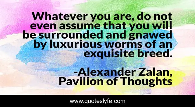This page presents the quote "Whatever you are, do not even assume that you will be surrounded and gnawed by luxurious worms of an exquisite breed.". Author of this quote is Alexander Zalan, Pavilion of Thoughts. This quote is about life, death, sarcasm, irony, result, outcome,.