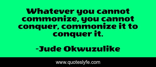 This page presents the quote "Whatever you cannot commonize, you cannot conquer, commonize it to conquer it.". Author of this quote is Jude Okwuzulike. This quote is about life, jude-okwuzulike, success, quote, conqer, motivational, confidence, wisdom, commonize,.