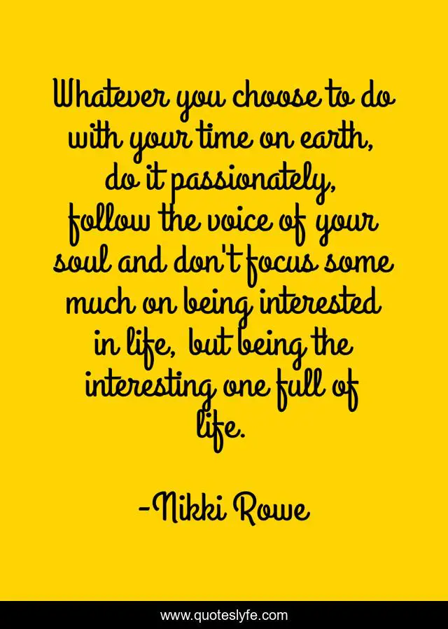 This page presents the quote "Whatever you choose to do with your time on earth, do it passionately, follow the voice of your soul and don't focus some much on being interested in life, but being the interesting one full of life.". Author of this quote is Nikki Rowe. This quote is about love, freedom, passion, life-lessons, free-spirit, affection,.