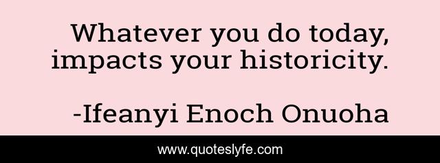 This page presents the quote "Whatever you do today, impacts your historicity.". Author of this quote is Ifeanyi Enoch Onuoha. This quote is about living, life, motivation, ifeanyi-enoch-onuoha, legacy, world, history,.