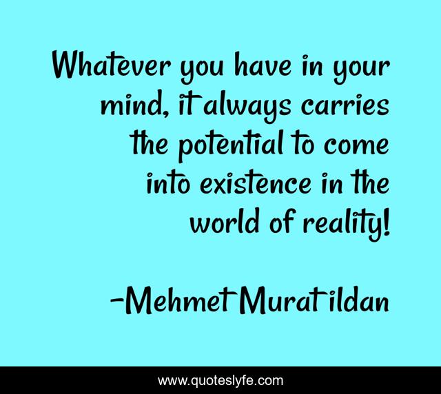 This page presents the quote "Whatever you have in your mind, it always carries the potential to come into existence in the world of reality!". Author of this quote is Mehmet Murat ildan. This quote is about come-into-existence, murat-ildan, ideas, mind, idea, reality, turkish-writers, turkish-literature, world-of-reality,.