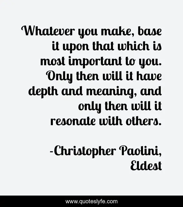 This page presents the quote "Whatever you make, base it upon that which is most important to you. Only then will it have depth and meaning, and only then will it resonate with others.". Author of this quote is Christopher Paolini, Eldest. This quote is about creations, work, saphira,.