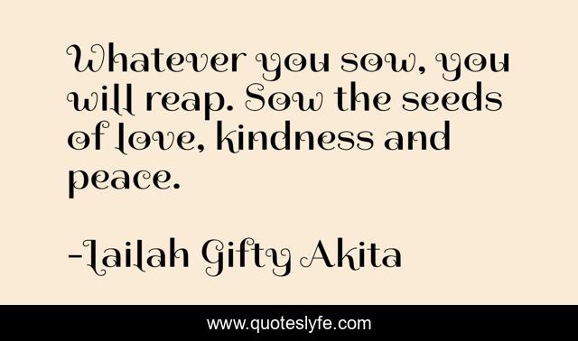 This page presents the quote "Whatever you sow, you will reap. Sow the seeds of love, kindness and peace.". Author of this quote is Lailah Gifty Akita. This quote is about confidence, sowing, positive, motivational, deeds, optimistic, kindness,.