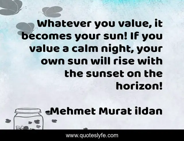 This page presents the quote "Whatever you value, it becomes your sun! If you value a calm night, your own sun will rise with the sunset on the horizon!". Author of this quote is Mehmet Murat ildan. This quote is about mehmet-murat-ildan, ildan-wise-sayings, turkish, ildan-wisdom, sun, turkish-playwrights, value, turkish-wisdom-words, horizon,.