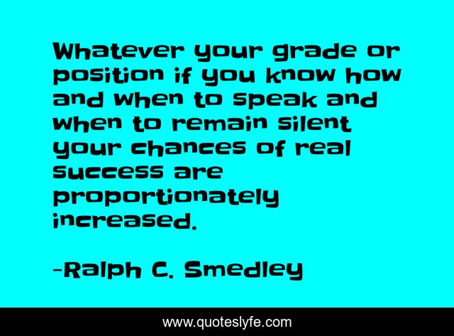 This page presents the quote "Whatever your grade or position if you know how and when to speak and when to remain silent your chances of real success are proportionately increased.". Author of this quote is Ralph C. Smedley. .