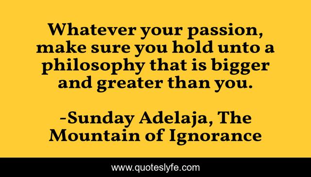 This page presents the quote "Whatever your passion, make sure you hold unto a philosophy that is bigger and greater than you.". Author of this quote is Sunday Adelaja, The Mountain of Ignorance. This quote is about mountain, life, darkness, power, danger, god, philosophy, people, ignorance,.