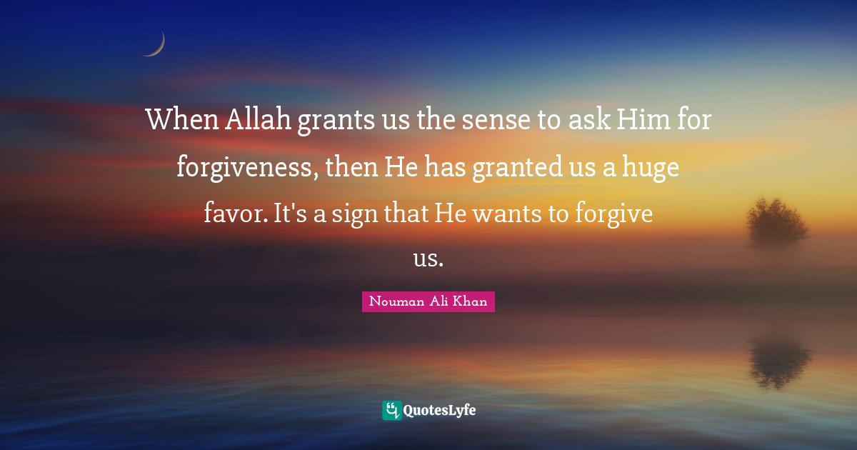 This page presents the quote "When Allah grants us the sense to ask Him for forgiveness, then He has granted us a huge favor. It's a sign that He wants to forgive us.". Author of this quote is Nouman Ali Khan. This quote is about grants, forgiving, favors, huge, granted, want, forgiveness,.