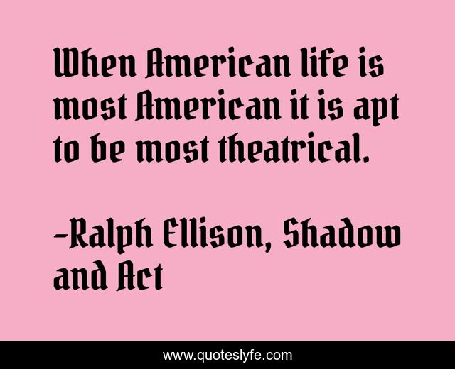 This page presents the quote "When American life is most American it is apt to be most theatrical.". Author of this quote is Ralph Ellison, Shadow and Act. This quote is about racism, blackface,.