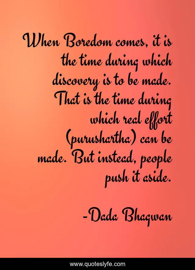 This page presents the quote "When Boredom comes, it is the time during which discovery is to be made. That is the time during which real effort (purushartha) can be made. But instead, people push it aside.". Author of this quote is Dada Bhagwan. This quote is about spiritual, discovery, effort, boredom, people,.