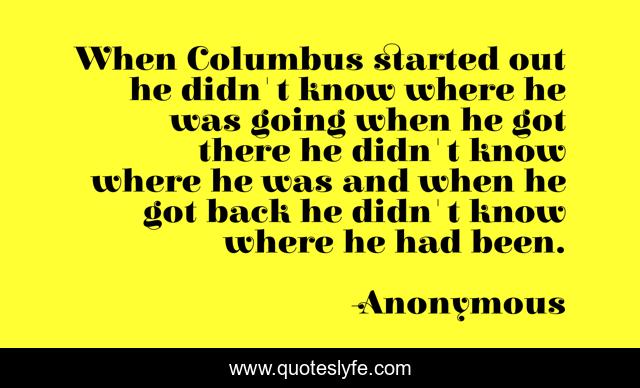 This page presents the quote "When Columbus started out he didn't know where he was going when he got there he didn't know where he was and when he got back he didn't know where he had been.". Author of this quote is Anonymous. .
