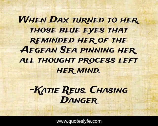 This page presents the quote "When Dax turned to her, those blue eyes that reminded her of the Aegean Sea pinning her, all thought process left her mind.". Author of this quote is Katie Reus, Chasing Danger. This quote is about military-romance, romantic-suspense,.