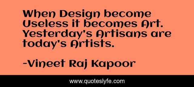 This page presents the quote "When Design become Useless it becomes Art. Yesterday's Artisans are today's Artists.". Author of this quote is Vineet Raj Kapoor. This quote is about function, use, curate, art, discovery, curator, functional, innovate, artisans,.