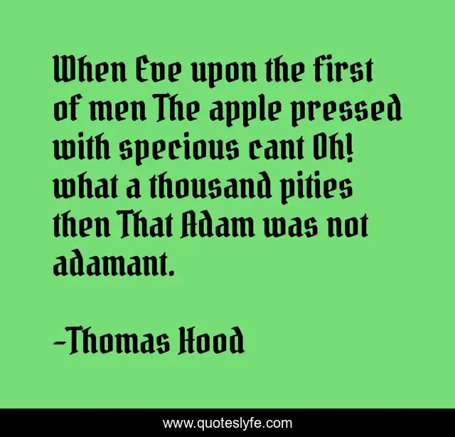 This page presents the quote "When Eve upon the first of men The apple pressed with specious cant Oh! what a thousand pities then That Adam was not adamant.". Author of this quote is Thomas Hood. This quote is about adam, eve,.