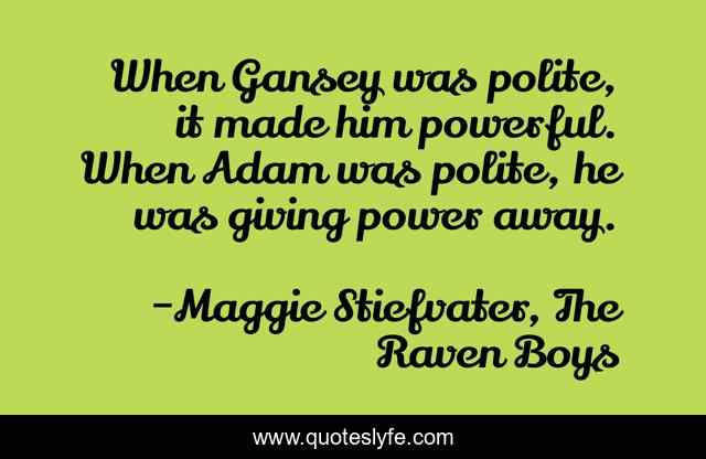This page presents the quote "When Gansey was polite, it made him powerful. When Adam was polite, he was giving power away.". Author of this quote is Maggie Stiefvater, The Raven Boys. This quote is about raven-boys, gansey, adam, power,.