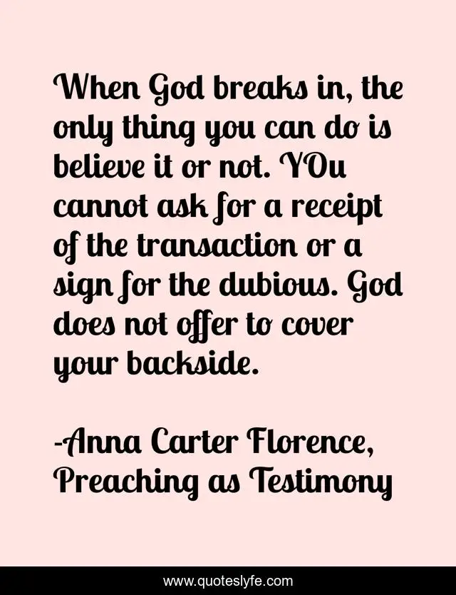 This page presents the quote "When God breaks in, the only thing you can do is believe it or not. YOu cannot ask for a receipt of the transaction or a sign for the dubious. God does not offer to cover your backside.". Author of this quote is Anna Carter Florence, Preaching as Testimony. This quote is about god, preaching,.