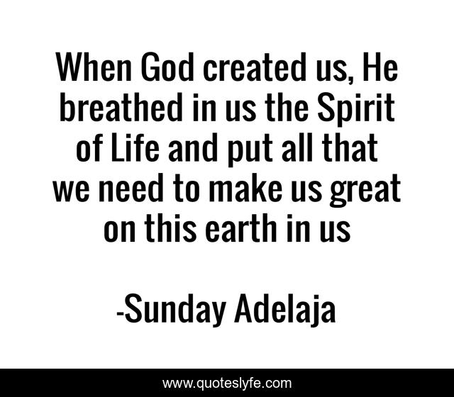 This page presents the quote "When God created us, He breathed in us the Spirit of Life and put all that we need to make us great on this earth in us". Author of this quote is Sunday Adelaja. This quote is about breathe, life, calling-fulfillment, purpose, spirit, goals,.