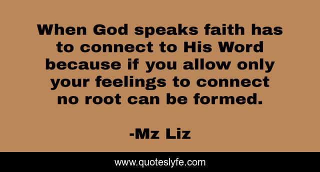 This page presents the quote "When God speaks faith has to connect to His Word because if you allow only your feelings to connect no root can be formed.". Author of this quote is Mz Liz. This quote is about faith, word-of-god, faith-in-god, feelings,.