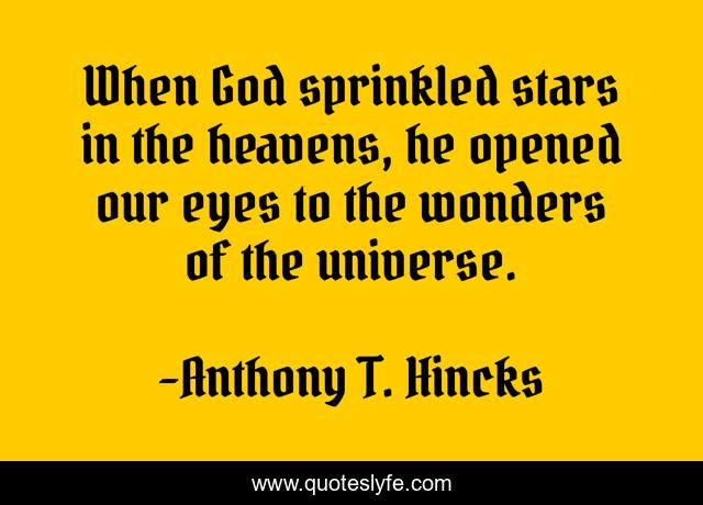 This page presents the quote "When God sprinkled stars in the heavens, he opened our eyes to the wonders of the universe.". Author of this quote is Anthony T. Hincks. This quote is about love, god, philosophy, religion, sprinkled, stars, universe, heavens, affection,.