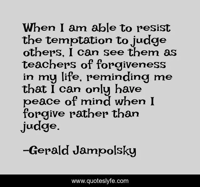 This page presents the quote "When I am able to resist the temptation to judge others, I can see them as teachers of forgiveness in my life, reminding me that I can only have peace of mind when I forgive rather than judge.". Author of this quote is Gerald Jampolsky. This quote is about life, peace, forgiveness,.