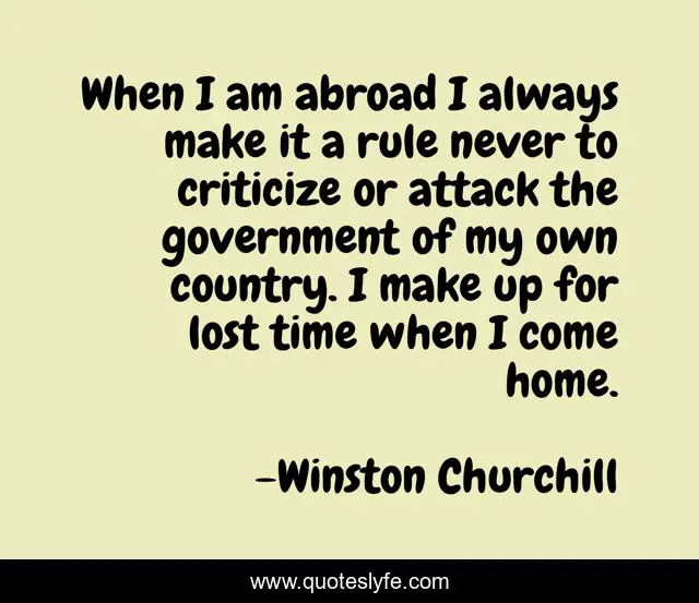 This page presents the quote "When I am abroad I always make it a rule never to criticize or attack the government of my own country. I make up for lost time when I come home.". Author of this quote is Winston Churchill. This quote is about rule, government,.