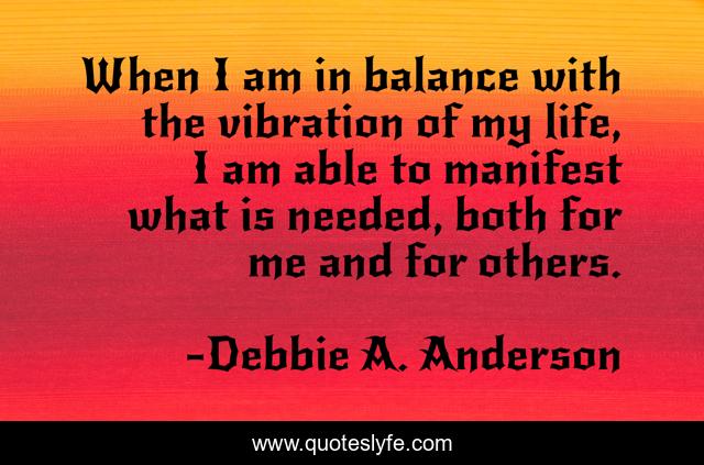 This page presents the quote "When I am in balance with the vibration of my life, I am able to manifest what is needed, both for me and for others.". Author of this quote is Debbie A. Anderson. This quote is about vibrational-energy, balance, life-and-living, manifest-your-bliss, vibrate-higher-daily,.