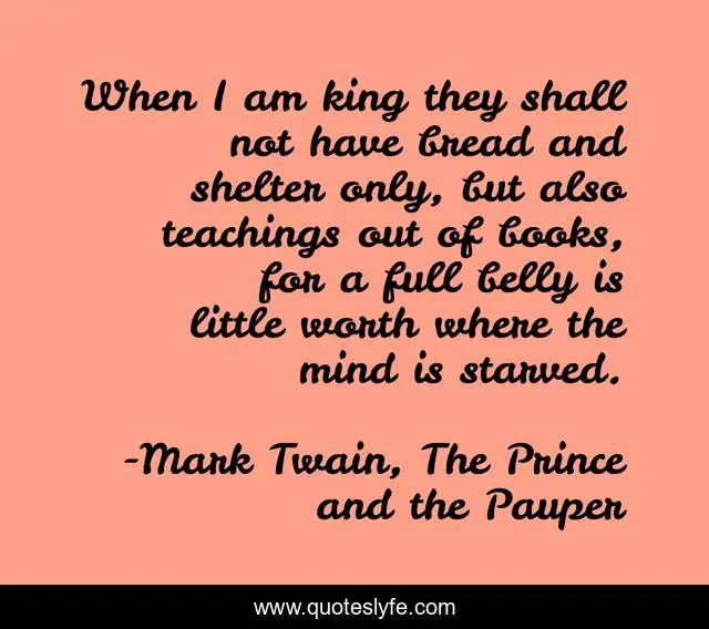 This page presents the quote "When I am king they shall not have bread and shelter only, but also teachings out of books, for a full belly is little worth where the mind is starved.". Author of this quote is Mark Twain, The Prince and the Pauper. This quote is about books, mind, education, reading,.