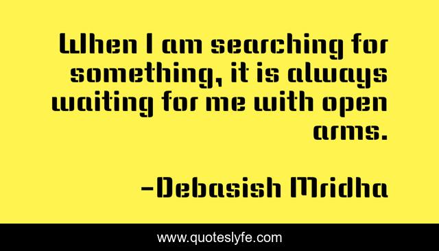 This page presents the quote "When I am searching for something, it is always waiting for me with open arms.". Author of this quote is Debasish Mridha. This quote is about waiting-for-me-with-open-arms, philosophy, debasish-mridha, quotes, searching-for-something, inspirational, enthusiasm, debasish-mridha-m-d,.