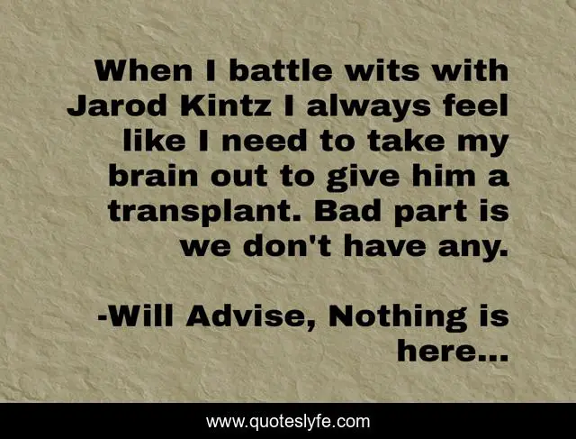 This page presents the quote "When I battle wits with Jarod Kintz I always feel like I need to take my brain out to give him a transplant. Bad part is we don't have any.". Author of this quote is Will Advise, Nothing is here.... This quote is about lacking, wits, giving, always, lack, argument, jarod-kintz, fight, witty,.