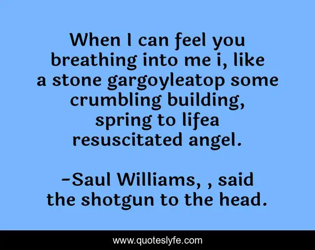 This page presents the quote "When I can feel you breathing into me i, like a stone gargoyleatop some crumbling building, spring to lifea resuscitated angel.". Author of this quote is Saul Williams, , said the shotgun to the head.. .