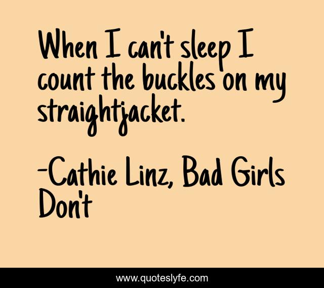 This page presents the quote "When I can't sleep I count the buckles on my straightjacket.". Author of this quote is Cathie Linz, Bad Girls Don't. This quote is about insomnia, insanity,.
