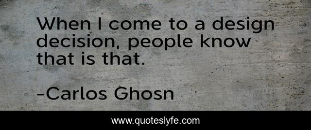 This page presents the quote "When I come to a design decision, people know that is that.". Author of this quote is Carlos Ghosn. This quote is about decision, people,.