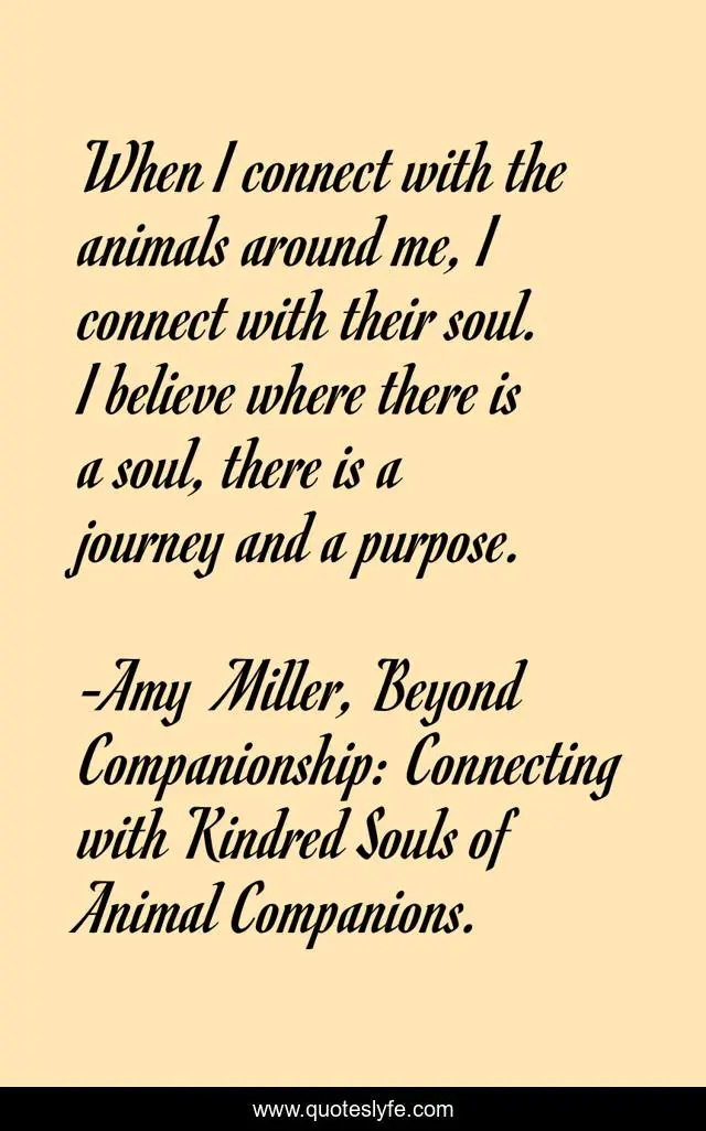 This page presents the quote "When I connect with the animals around me, I connect with their soul. I believe where there is a soul, there is a journey and a purpose.". Author of this quote is Amy Miller, Beyond Companionship: Connecting with Kindred Souls of Animal Companions.. This quote is about journey, animals, soul,.