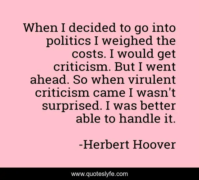 This page presents the quote "When I decided to go into politics I weighed the costs. I would get criticism. But I went ahead. So when virulent criticism came I wasn't surprised. I was better able to handle it.". Author of this quote is Herbert Hoover. .