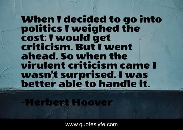 This page presents the quote "When I decided to go into politics I weighed the cost: I would get criticism. But I went ahead. So when the virulent criticism came I wasn't surprised. I was better able to handle it.". Author of this quote is Herbert Hoover. This quote is about realistic, expectations,.