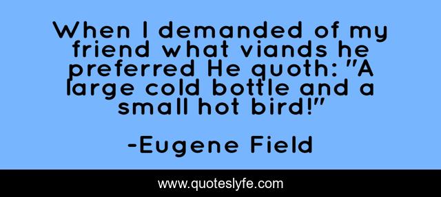 This page presents the quote "When I demanded of my friend what viands he preferred He quoth: "A large cold bottle and a small hot bird!"". Author of this quote is Eugene Field. .