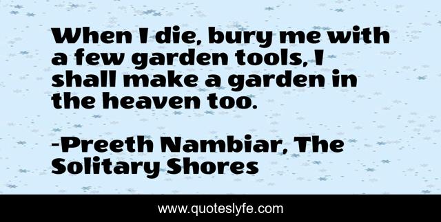 This page presents the quote "When I die, bury me with a few garden tools, I shall make a garden in the heaven too.". Author of this quote is Preeth Nambiar, The Solitary Shores. This quote is about heaven, gardening, garden,.