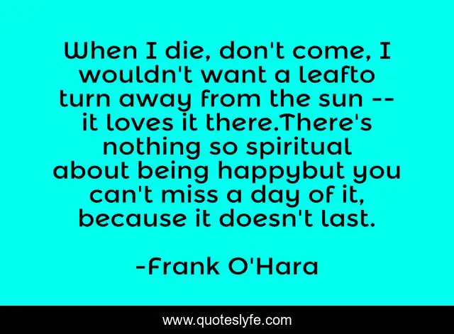 This page presents the quote "When I die, don't come, I wouldn't want a leafto turn away from the sun -- it loves it there.There's nothing so spiritual about being happybut you can't miss a day of it, because it doesn't last.". Author of this quote is Frank O'Hara. This quote is about death, poetry, happiness,.