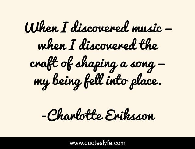 This page presents the quote "When I discovered music — when I discovered the craft of shaping a song — my being fell into place.". Author of this quote is Charlotte Eriksson. This quote is about identity, singersongwriter, songwriter, musician, creativity, writing, finding, music, purpose,.